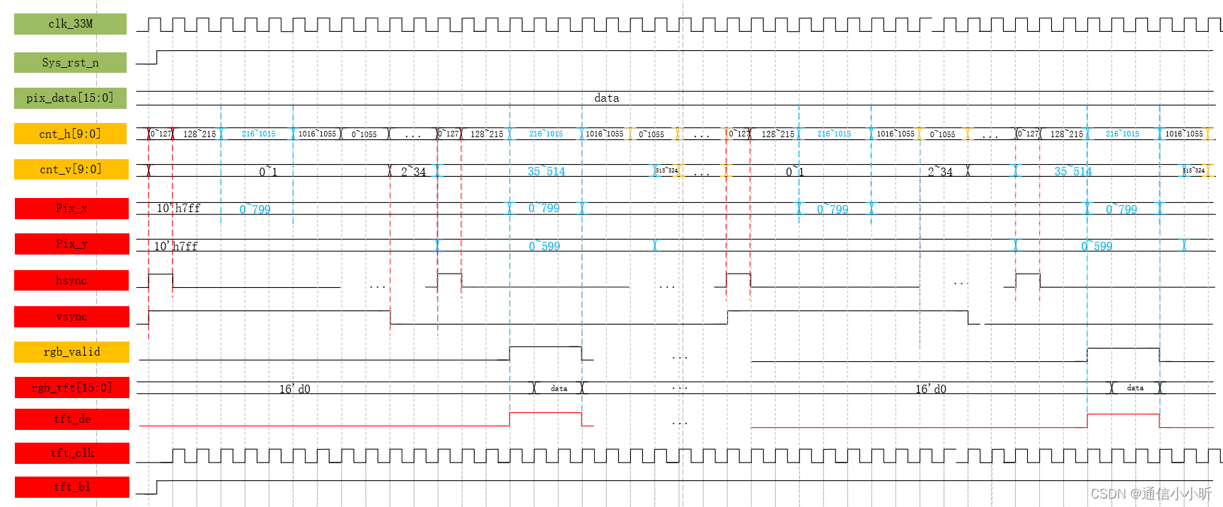 (2)根据时序参数,确定涉及到控制行场同步信号和有效像素点cnt_h和cnt_v的关键数值,比如检测到cnt_h==0拉高行同步信号hsync,检测到cnt_h==127就拉低行同步信号hsync;检测到cnt_h==216,开始令pix_x为有效数据